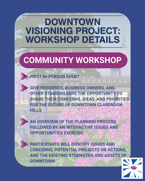 The Village of Clarendon Hills is hosting a Visioning Session on October 22nd. Residents and Businesses are invited to share their thoughts on the future of our downtown. Please see info below.