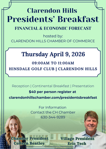 We are excited to invite you to our upcoming Clarendon Hills Presidents' with presentations by Village President Eric Tech and Chamber President Colleen Bentley, offering valuable insights into our local economic landscape and